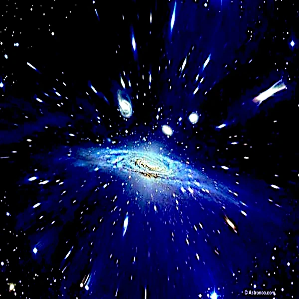 Descrição da imagem: Se um observador viaja a uma velocidade muito alta, próxima à velocidade da luz, ele terá a ilusão de ver à sua frente todos os objetos do Universo, tanto os situados à frente quanto os situados atrás. Todos os objetos tenderão a se agrupar na direção para a qual o observador se dirige. Este é o fenômeno da aberração da luz. Além disso, pelo efeito Doppler, os comprimentos de onda das fontes luminosas se comprimirão e a paisagem se tingirá ligeiramente de azul. Finalmente, a quantidade de luz variará consideravelmente, tornando-se mais forte à frente e mais fraca atrás. Fonte da imagem: astronoo.com