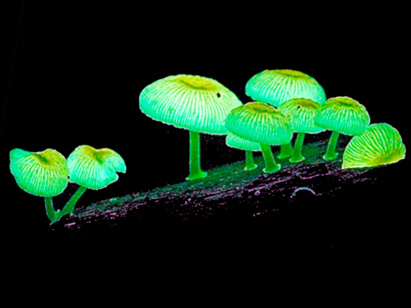 Mycena chlorophos (Hongo tropical) - Emite un resplandor verde en la oscuridad, probablemente para atraer insectos y dispersar sus esporas.